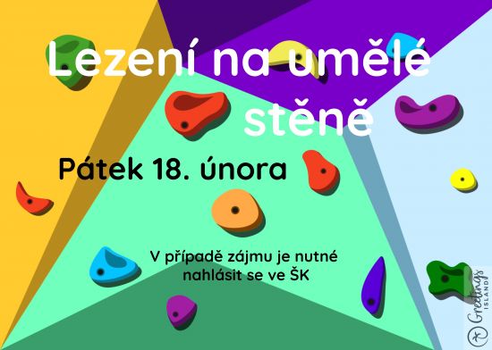 Pokud máš chuť zkusit si něco nového, nebo procvičit si co už umíš, přijď porovnat síly na naši umělou lezeckou stěnu. Lozit budeme v pátek 18. února. Co pro to musíš udělat? Přihlásit se ve ŠK, přinést si sportovní obuv, oblečení a pití.
