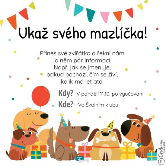 Máš svého domácího mazlíka a chceš ho představit? Ve školním klubu máš jedinečnou příležitost! V pondělí 11.10. po vyučování nám o něm můžeš říct víc. Pokud doma zvířátko nemáš, nezoufej a přines si plyšového miláčka. Těšíme se na Vás.