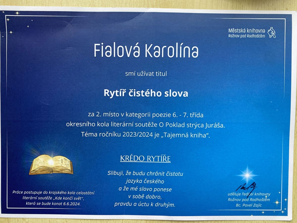 Všem oceněným moc gratulujeme a držíme pěsti, aby se jim s jejich příběhem a básněmi podobně skvěle vedlo i v krajském kole.