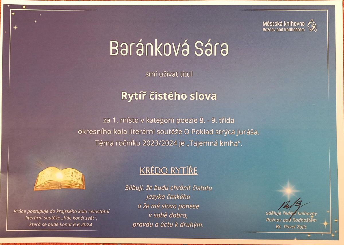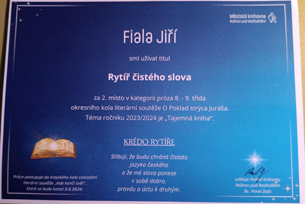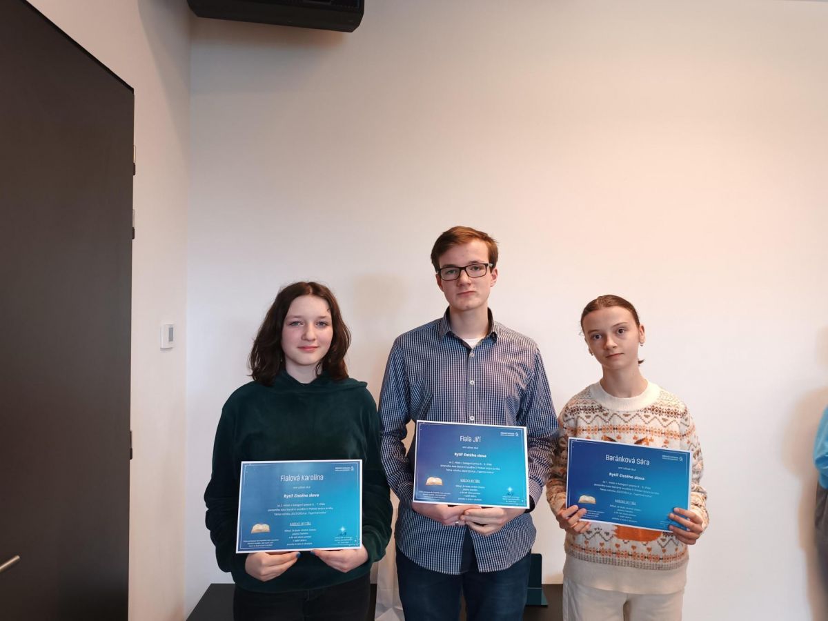 V kategorii próza 8. a 9. třída se na 2. místě umístil Jiří Fiala (9.A) a v kategorii poezie 8. a 9. třída rovněž na 1. místě Sára Baránková (8.A).