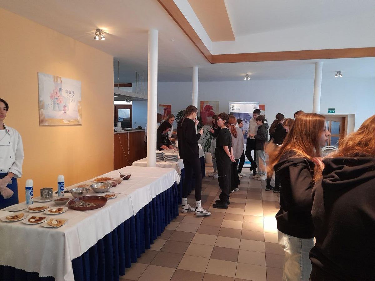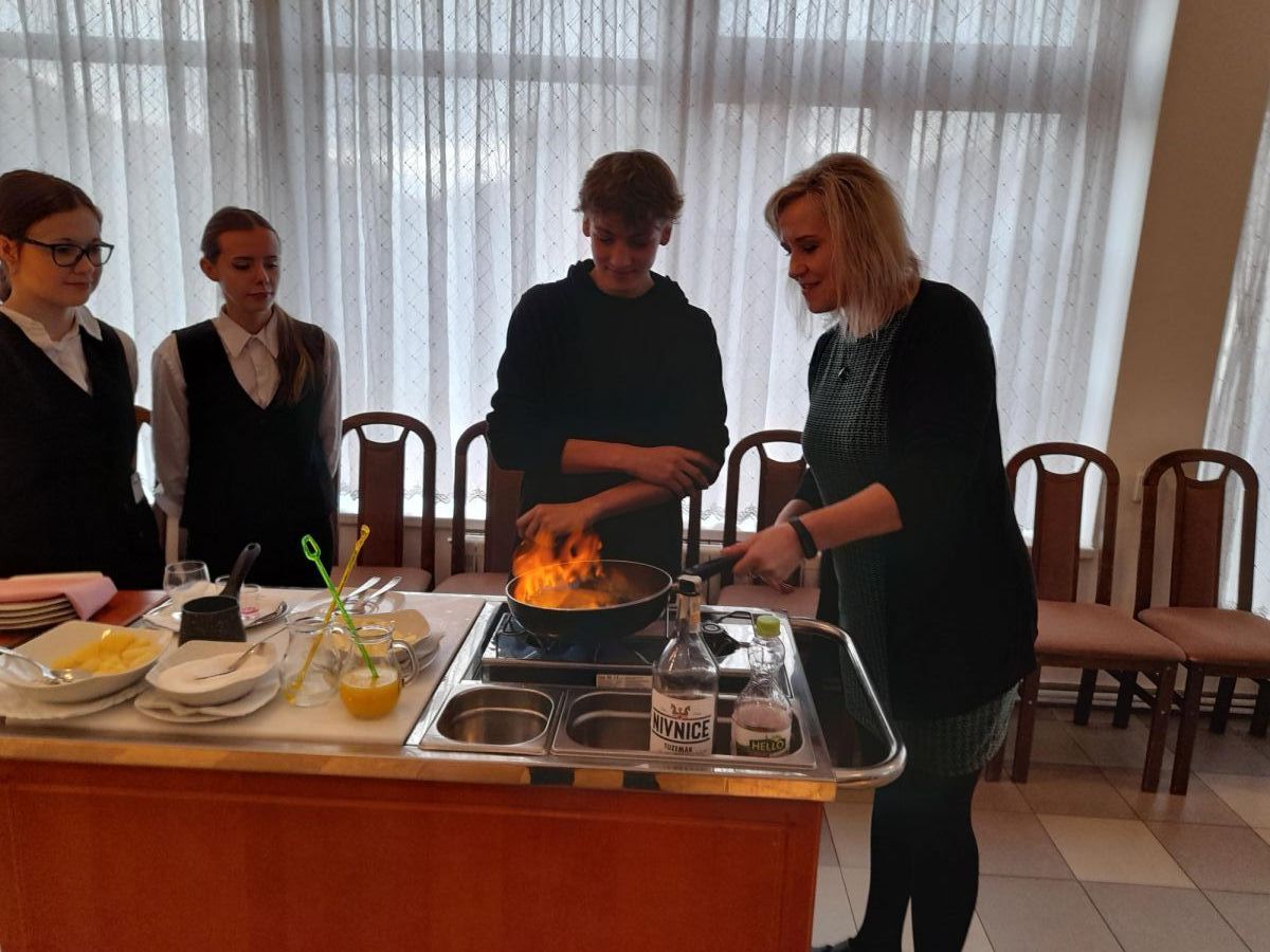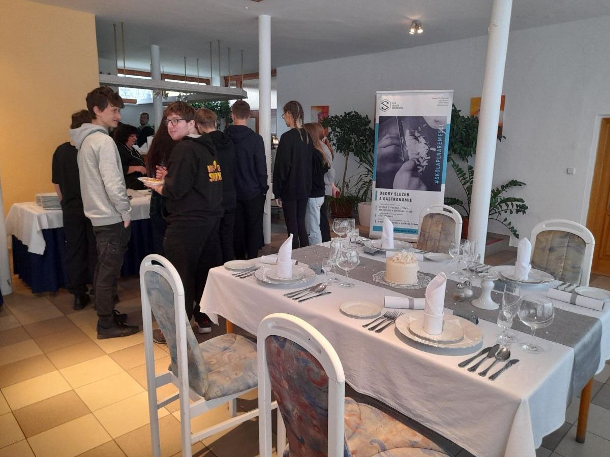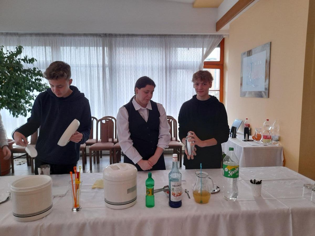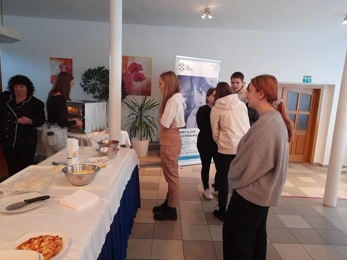 Když jsme přišli, tak nás příjemně uvítali a ukázali nám prezentaci o daném oboru gastronomie. Následovně jsme se přemístili do třetího patra, kde na nás čekala „zábava“. Mohli jsme si udělat pizzu, namíchat drinky, ochutnat palačinky nebo si zkusit flambovat ananas a připravit výborné kafé. Když jsme si prošli všechny prostory - přípravny, byl nám poskytnut výklad o etiketě - stolování v restauraci (ukázkou byl svatební stůl). V přízemí jsme se věnovali zdobení perníčků a tvarovali myšky z marcipánu. Za nás deváťáky, děkujeme za úžasnou akci s doprovodem paní učitelky Drahomíry Šeré.