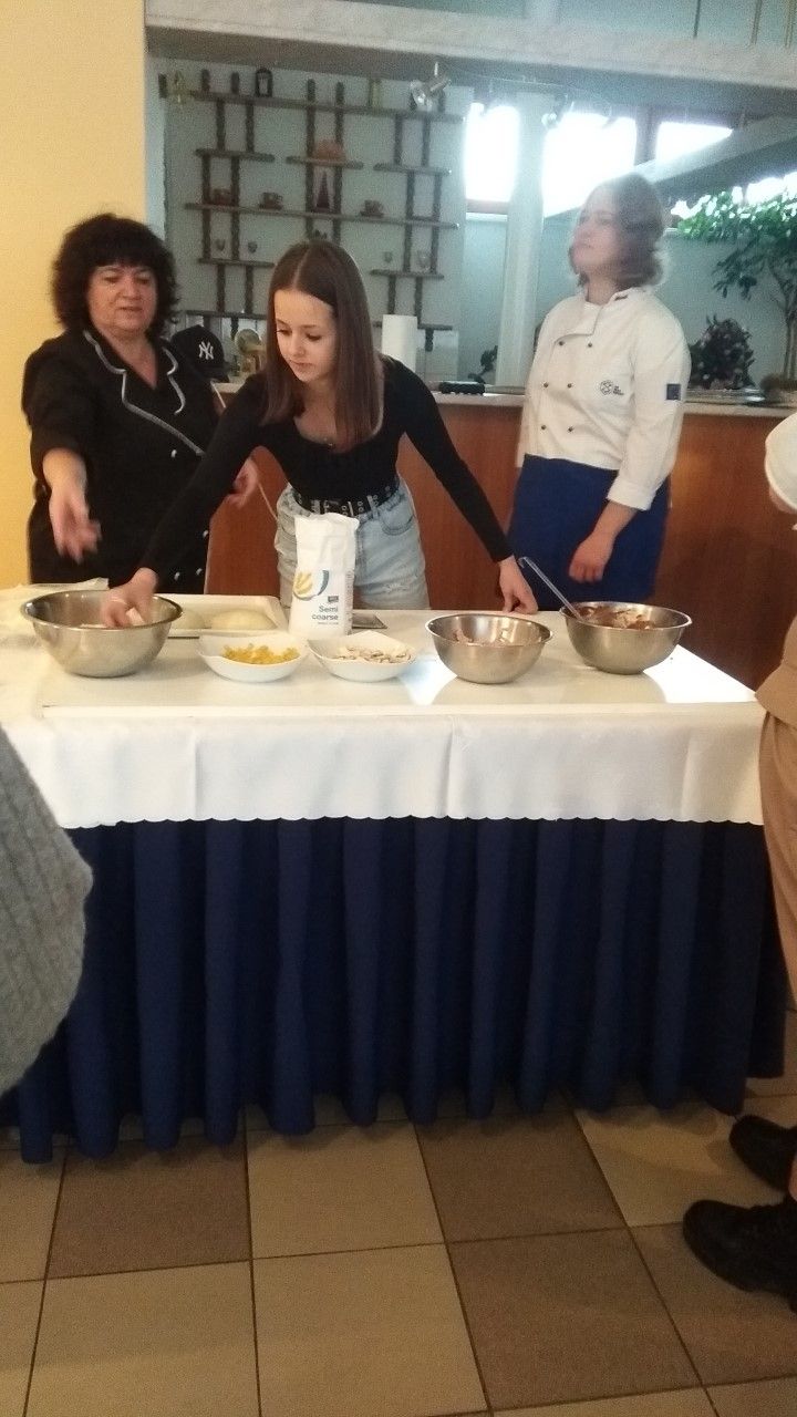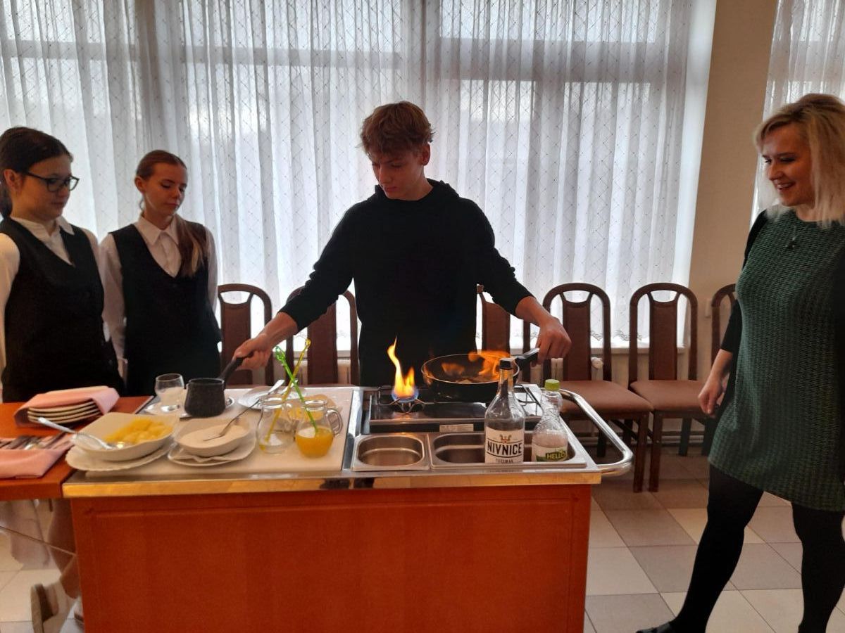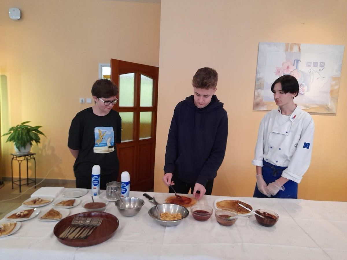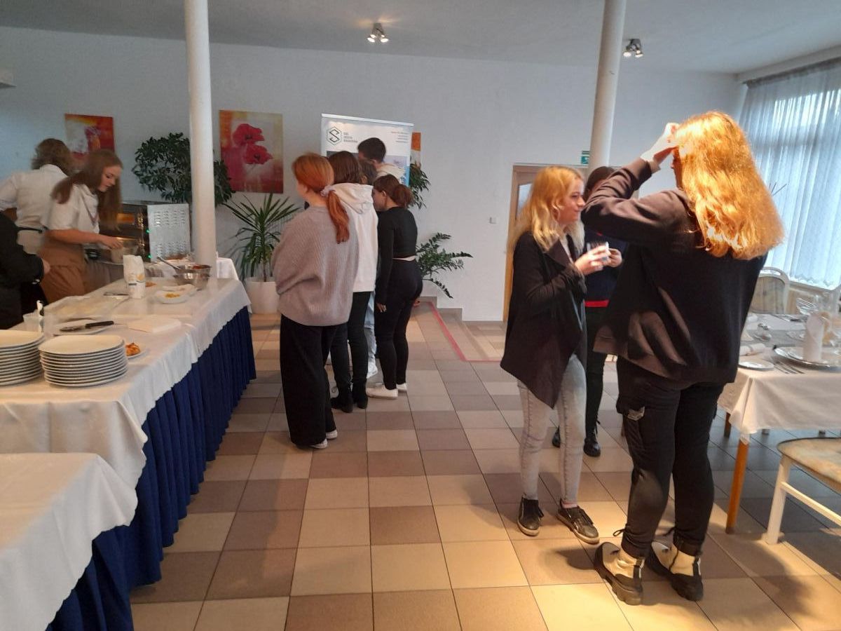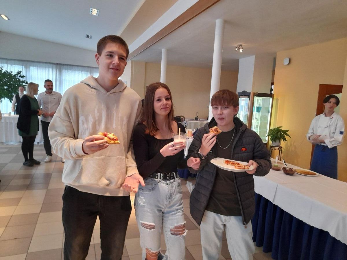 Když jsme přišli, tak nás příjemně uvítali a ukázali nám prezentaci o daném oboru gastronomie. Následovně jsme se přemístili do třetího patra, kde na nás čekala „zábava“. Mohli jsme si udělat pizzu, namíchat drinky, ochutnat palačinky nebo si zkusit flambovat ananas a připravit výborné kafé. Když jsme si prošli všechny prostory - přípravny, byl nám poskytnut výklad o etiketě - stolování v restauraci (ukázkou byl svatební stůl). V přízemí jsme se věnovali zdobení perníčků a tvarovali myšky z marcipánu. Za nás deváťáky, děkujeme za úžasnou akci s doprovodem paní učitelky Drahomíry Šeré.