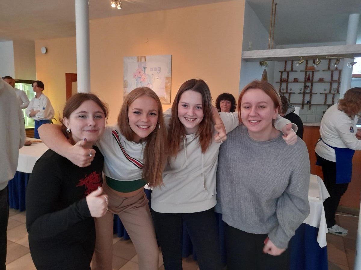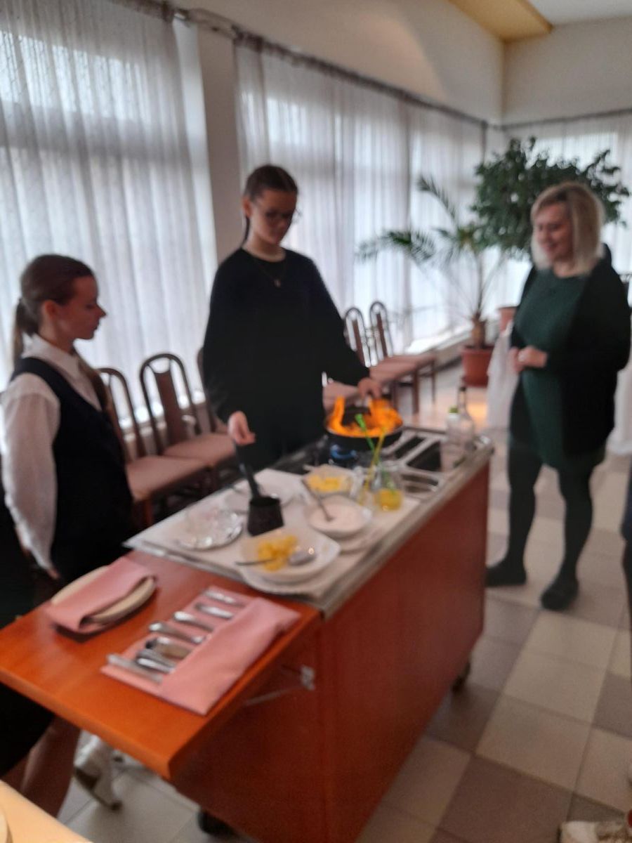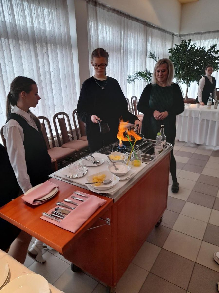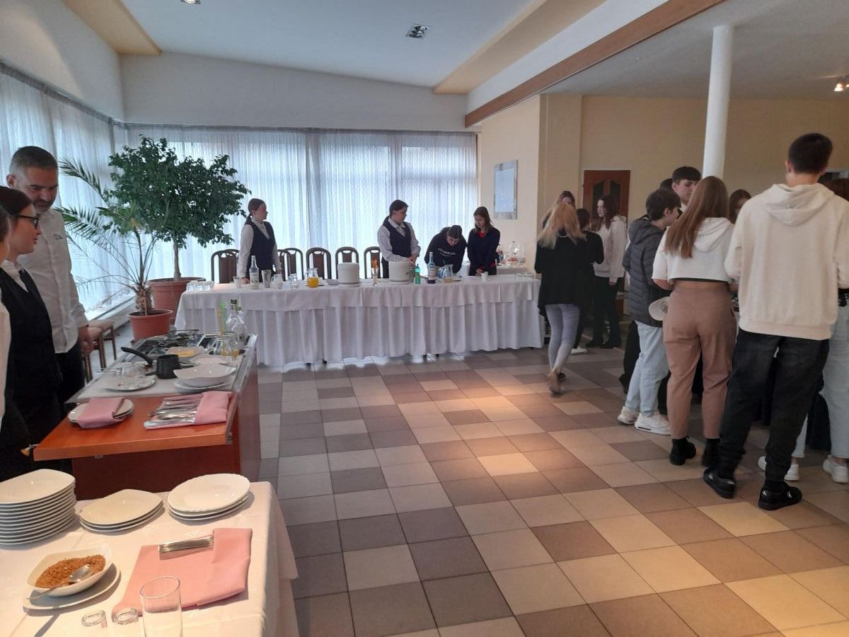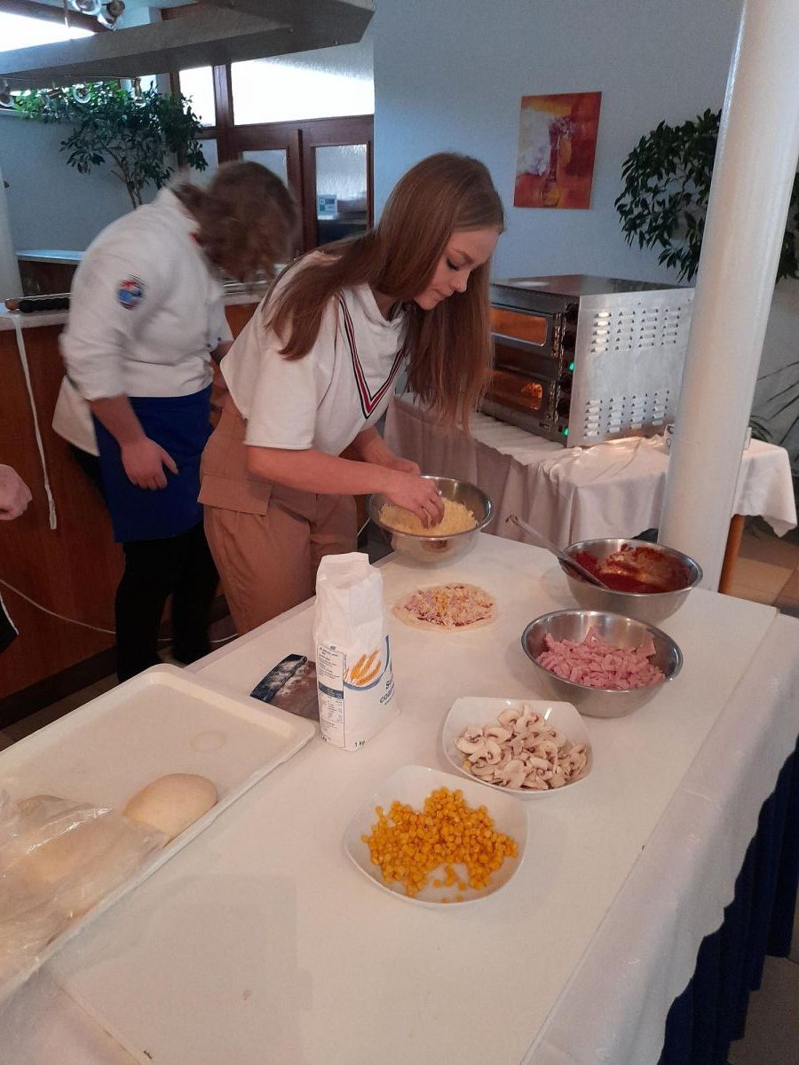 Když jsme přišli, tak nás příjemně uvítali a ukázali nám prezentaci o daném oboru gastronomie. Následovně jsme se přemístili do třetího patra, kde na nás čekala „zábava“. Mohli jsme si udělat pizzu, namíchat drinky, ochutnat palačinky nebo si zkusit flambovat ananas a připravit výborné kafé. Když jsme si prošli všechny prostory - přípravny, byl nám poskytnut výklad o etiketě - stolování v restauraci (ukázkou byl svatební stůl). V přízemí jsme se věnovali zdobení perníčků a tvarovali myšky z marcipánu. Za nás deváťáky, děkujeme za úžasnou akci s doprovodem paní učitelky Drahomíry Šeré.