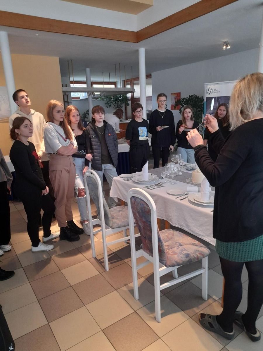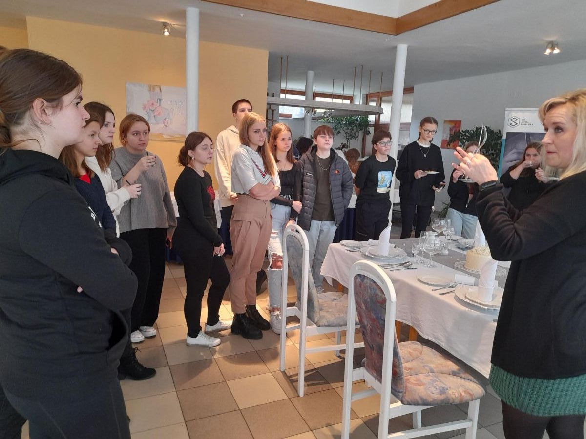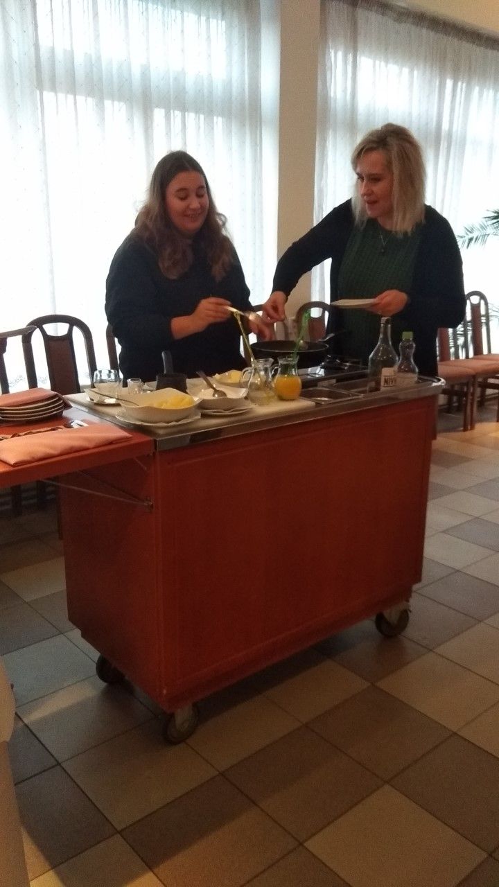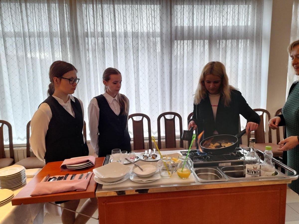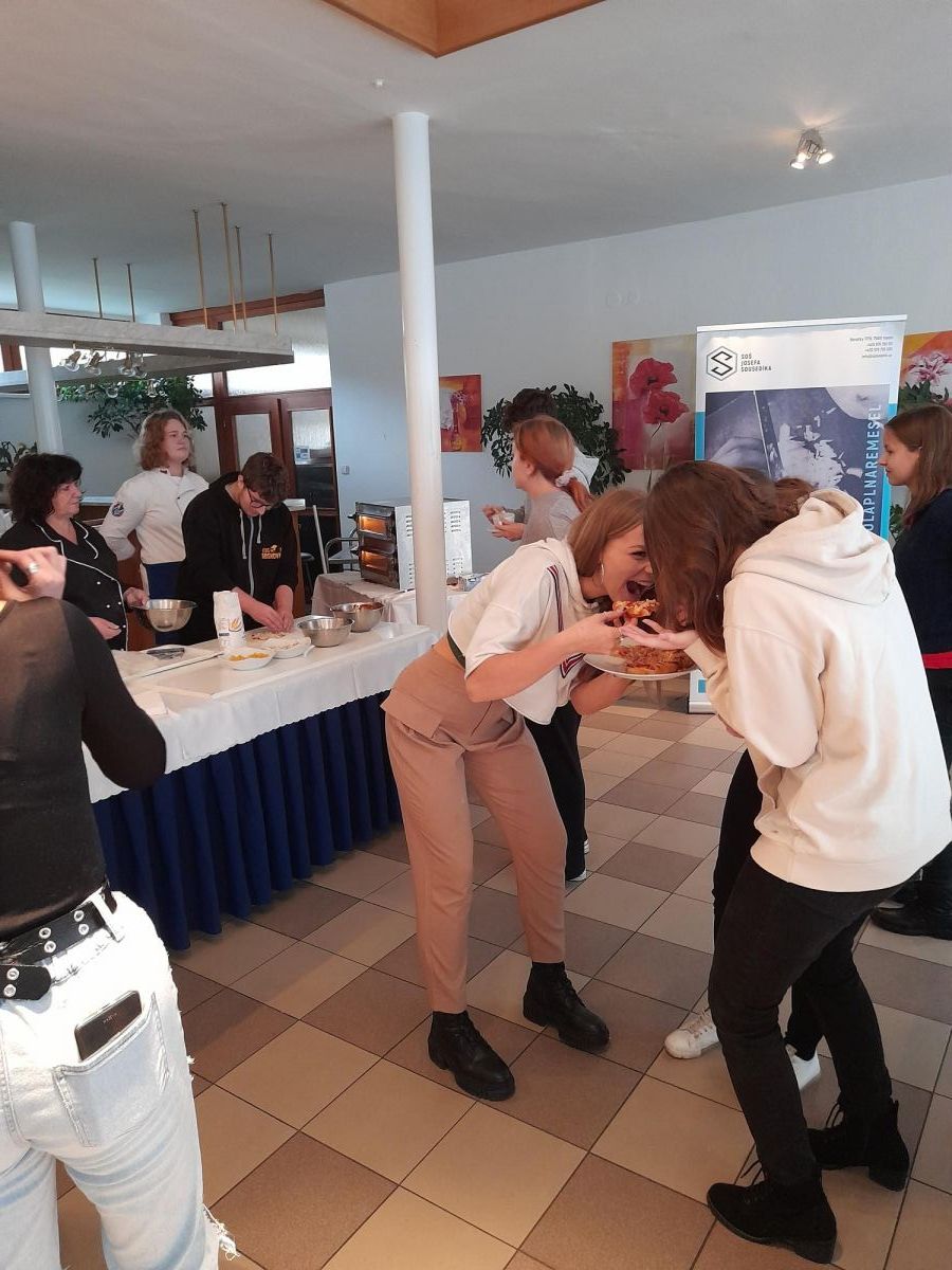 Když jsme přišli, tak nás příjemně uvítali a ukázali nám prezentaci o daném oboru gastronomie. Následovně jsme se přemístili do třetího patra, kde na nás čekala „zábava“. Mohli jsme si udělat pizzu, namíchat drinky, ochutnat palačinky nebo si zkusit flambovat ananas a připravit výborné kafé. Když jsme si prošli všechny prostory - přípravny, byl nám poskytnut výklad o etiketě - stolování v restauraci (ukázkou byl svatební stůl). V přízemí jsme se věnovali zdobení perníčků a tvarovali myšky z marcipánu. Za nás deváťáky, děkujeme za úžasnou akci s doprovodem paní učitelky Drahomíry Šeré.