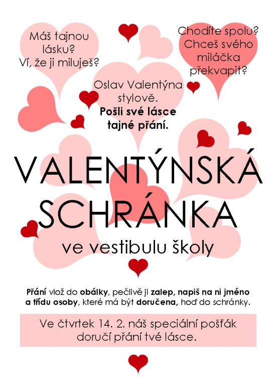 Vhoď přání do speciální valentýnské schránky, kterou najdeš ve vestibulu školy. Náš pošťák doručí tvé přání osobě, kterou miluješ v den svatého Valentýna.