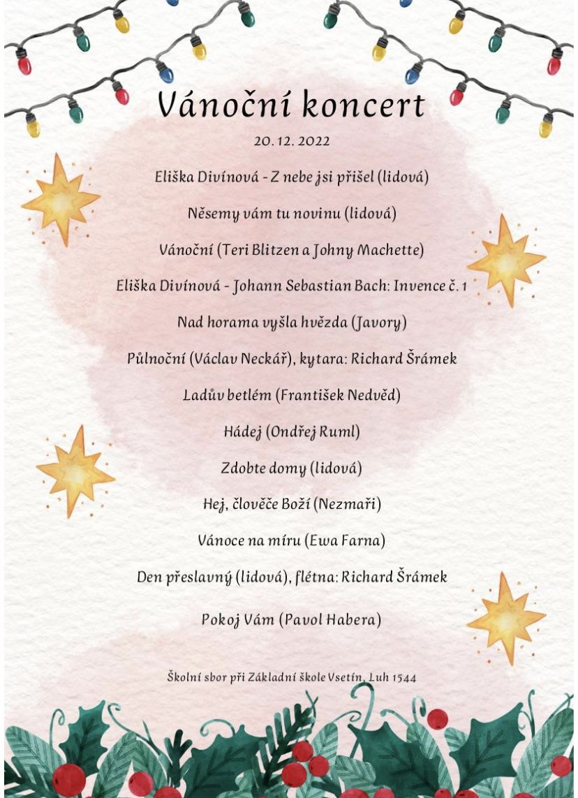 Kromě známějších písní, jako jsou Vánoce na míru nebo Půlnoční, zazněly i méně známé lidové koledy, např. Něsemy vám tu novinu nebo Hej, člověče boží.
