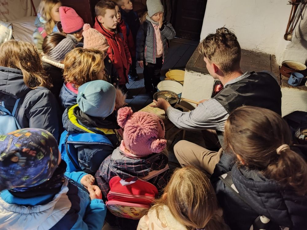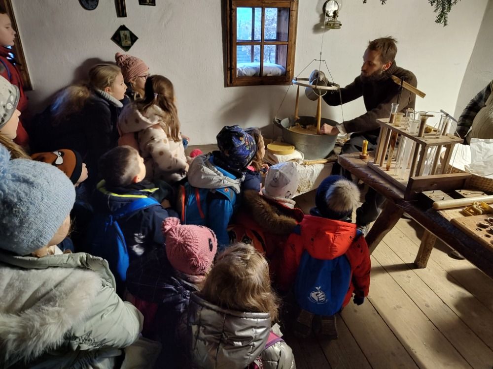 Pozorovali jsme přadleny při předení a řemeslné práce řezbáře i kováře. Obdivovali jsme zručné zdobení perníčků, pečení mikulášského pečiva a vánočních oplatků, výrobu svíček ze včelího vosku či starý zvyk odlévání olova a pouštění lodiček.
