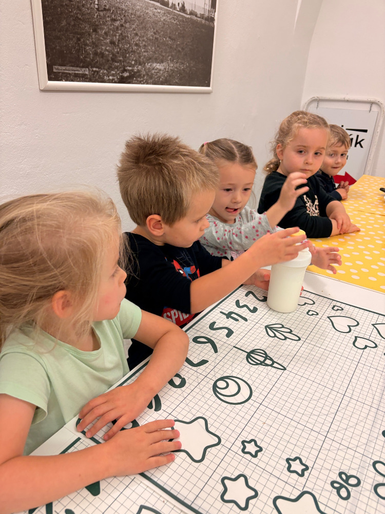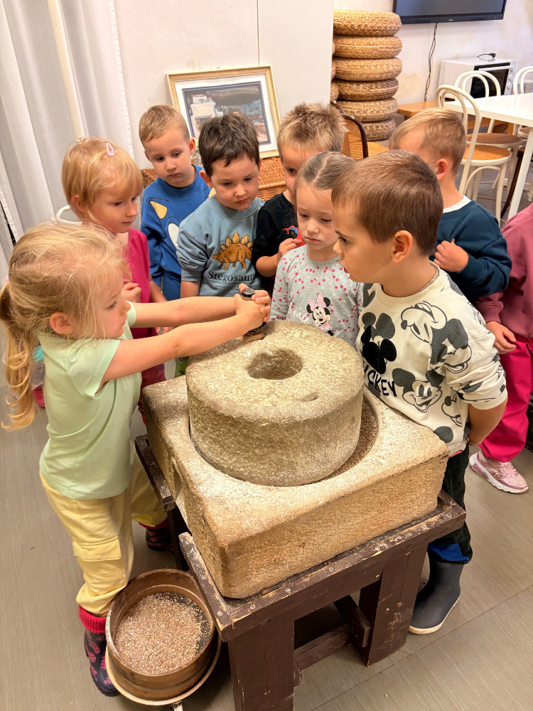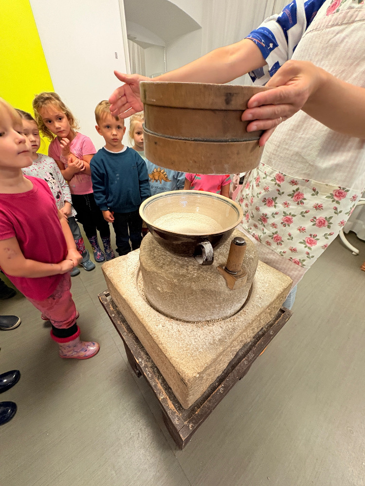 Program začal hravou formou, kdy si děti mohly samy vyzkoušet, jak se dříve vyrábělo máslo – s nadšením tloukly smetanu v máselnici a sledovaly, jak se mění v lahodný výsledek. Poté se přesunuly k mlýnku, kde si umlely mouku z obilí. Vrcholem dne bylo tvoření vlastních žitných placek, které si děti samy vyválely a připravily k pečení. Po práci přišla zasloužená odměna – ochutnávka vlastních výtvorů. Děti si s chutí pochutnaly na plackách, které si samy připravily, a s úsměvem na tváři odcházely zpět do MŠ s novými zážitky a vědomostmi.