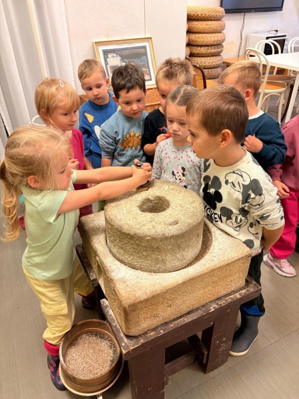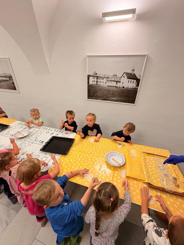 Pro naše malé včeličky byl připraven lektorský program s tématem „Co se dříve jedlo a pilo“, který jim umožnil nahlédnout do tajů tradičního zpracování potravin. Program začal hravou formou, kdy si děti mohly samy vyzkoušet, jak se dříve vyrábělo máslo – s nadšením tloukly smetanu v máselnici a sledovaly, jak se mění v lahodný výsledek. Poté se přesunuly k mlýnku, kde si umlely mouku z obilí. Vrcholem dne bylo tvoření vlastních žitných placek, které si děti samy vyválely a připravily k pečení. Po práci přišla zasloužená odměna – ochutnávka vlastních výtvorů. Děti si s chutí pochutnaly na plackách, které si samy připravily, a s úsměvem na tváři odcházely zpět do MŠ s novými zážitky a vědomostmi.