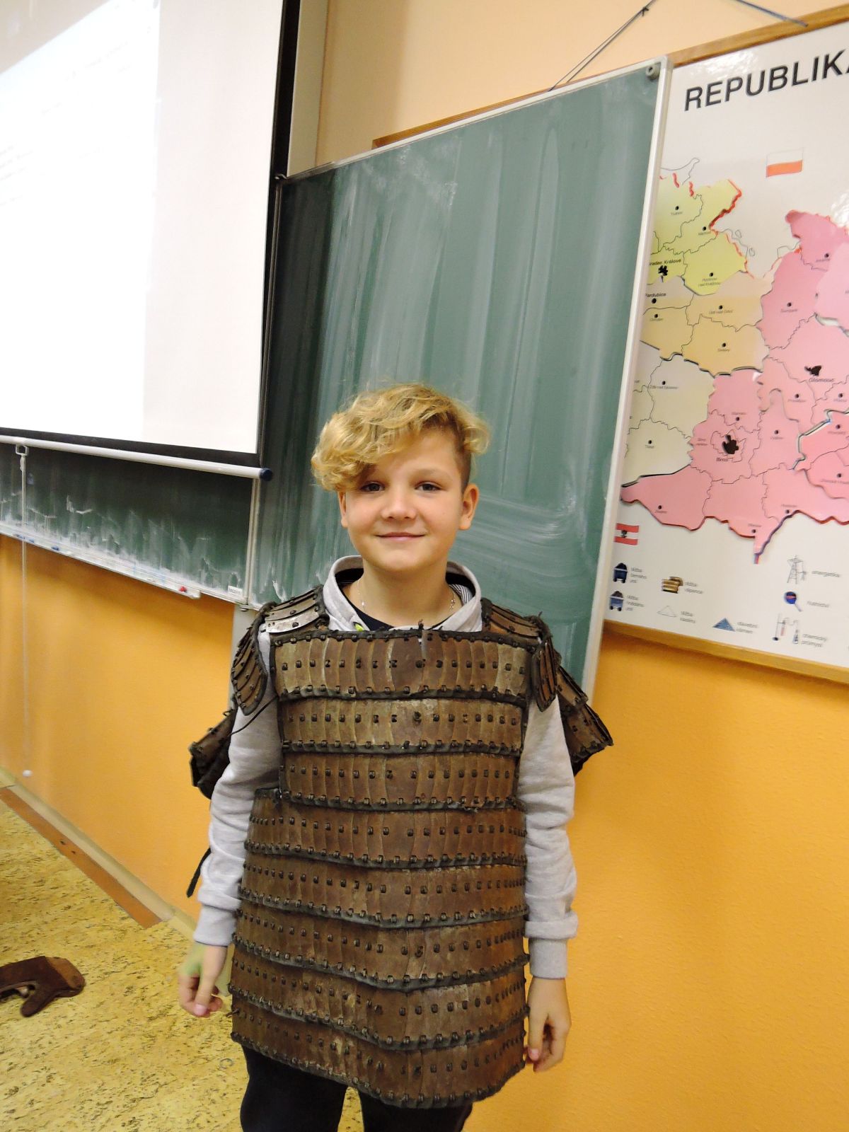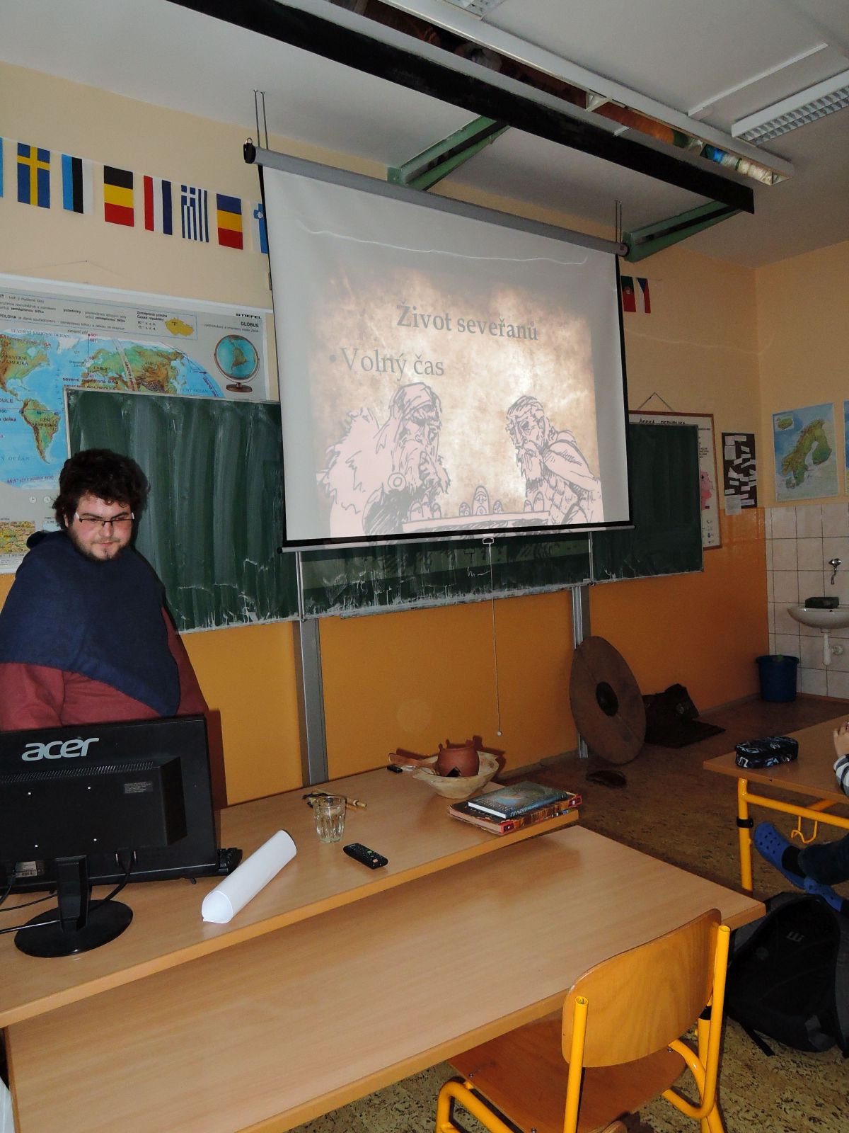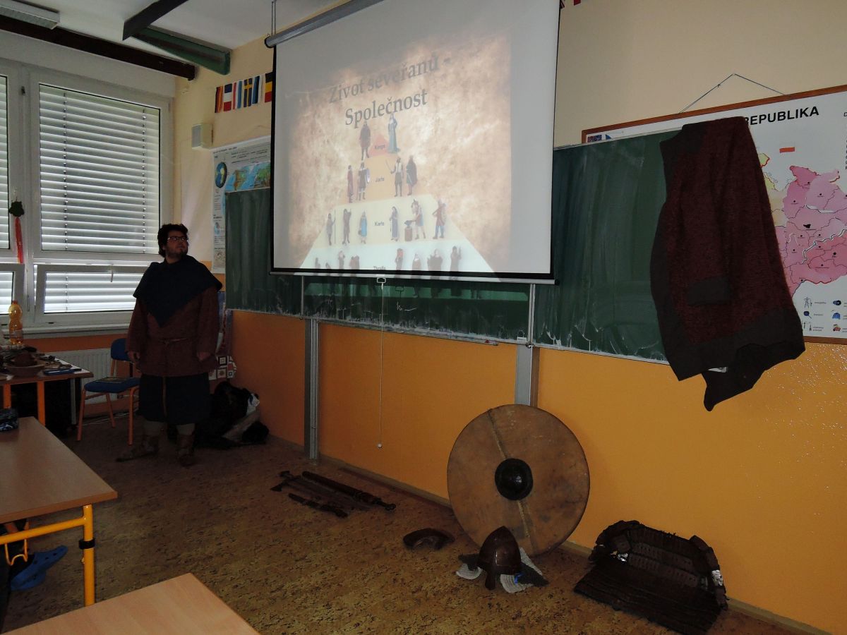 Nejednalo se o pravého Vikinga, ale o pana Lukeše, který se danému tématu věnuje jako koníčku. Pomocí prezentace jim představil, kdo to byli Vikingové, kde žili, čím se živili, jak vypadali jejich lodě, ale také jak se nazývali jejich bohové, co nosili na sobě, jak trávili volný čas. Vše bylo doplněno názornými ukázkami a předměty, které si každý mohl prohlédnout a osahat. Nejvíce snad všechny zaujala zbroj, meč, štít, sekera a helma, které si ještě po skončení přednášky řada žáků vyzkoušela, včetně nasazení přílby vikingského bojovníka.