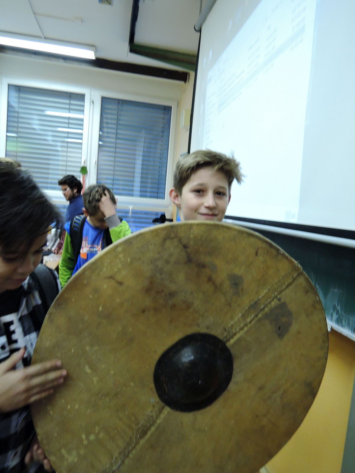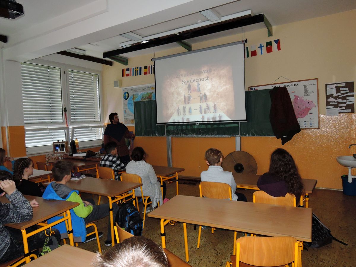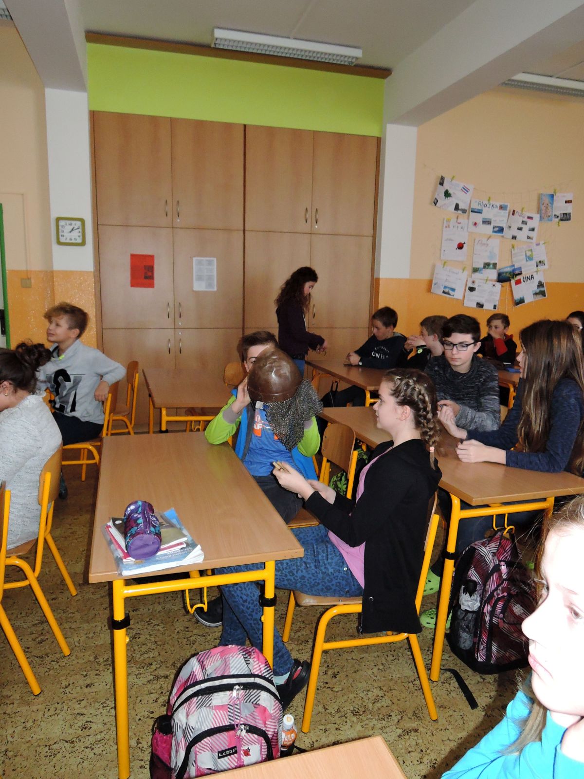 Nejednalo se o pravého Vikinga, ale o pana Lukeše, který se danému tématu věnuje jako koníčku. Pomocí prezentace jim představil, kdo to byli Vikingové, kde žili, čím se živili, jak vypadali jejich lodě, ale také jak se nazývali jejich bohové, co nosili na sobě, jak trávili volný čas. Vše bylo doplněno názornými ukázkami a předměty, které si každý mohl prohlédnout a osahat. Nejvíce snad všechny zaujala zbroj, meč, štít, sekera a helma, které si ještě po skončení přednášky řada žáků vyzkoušela, včetně nasazení přílby vikingského bojovníka.