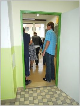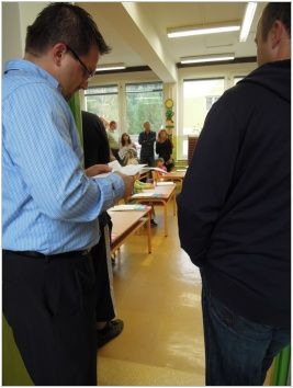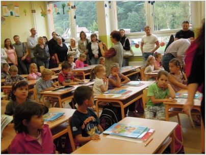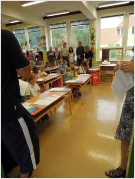 Žáci devátých ročníků byli rozděleni na dvě skupiny, jedna u předního vchodu a ta druhá u zadního vchodu. Všichni jsme se snažili rodiče a děti nasměrovat do správné šatny a třídy. Poté si je převzaly paní učitelky, které se o ně budou starat následujících deset měsíců.