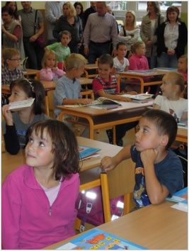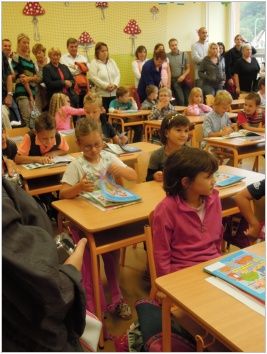 V letošním roce se o jejich přivítání postarali nejen paní učitelky, ale i my, žáci devátých tříd. U třídy 1.A mohli budoucí prvňáčci potkat např. berušku, která je přivítala a poté dětem dala kartičku s jejich jménem a obrázkem.