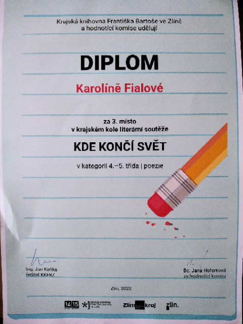 Celkem 5 literárních prací, ať už poezie či próza, postoupilo z okresního kola O poklad strýca Juráša do krajského kola literární soutěže Kde končí svět 2021/2022, které vyhlašuje každoročně Krajská knihovna Františka Bartoše ve Zlíně. Jsme velmi pyšní na Karolínu Fialovou z 5.B třídy, která  se svou básní Covidová - už jsme ji na stránkách publikovali - získala tento týden krásné 3. místo v kraji.