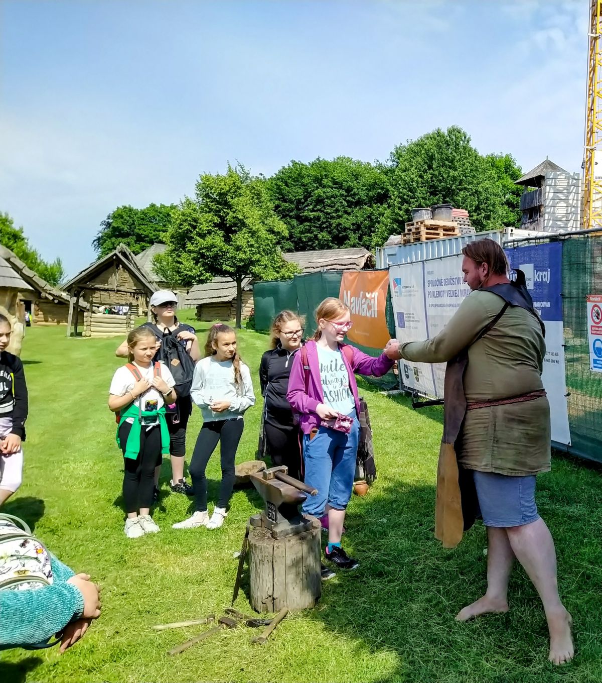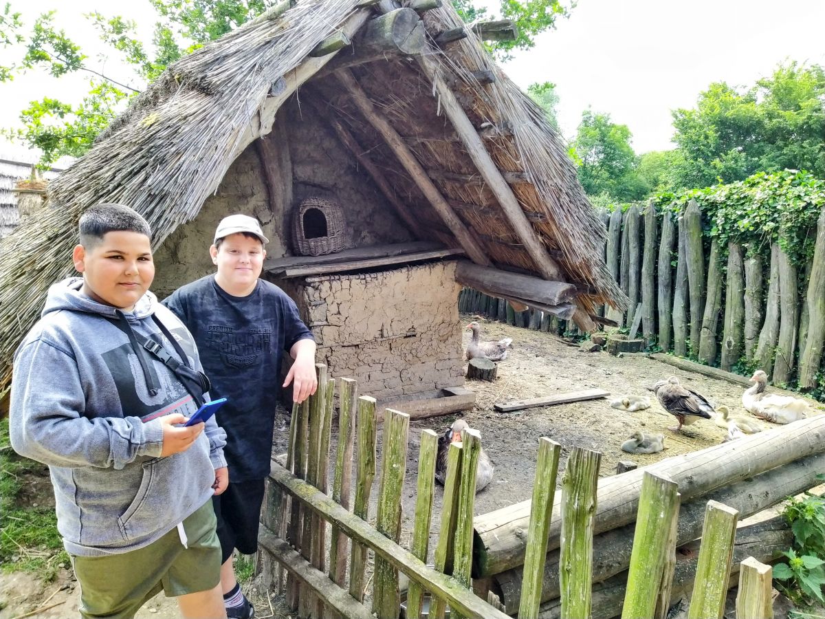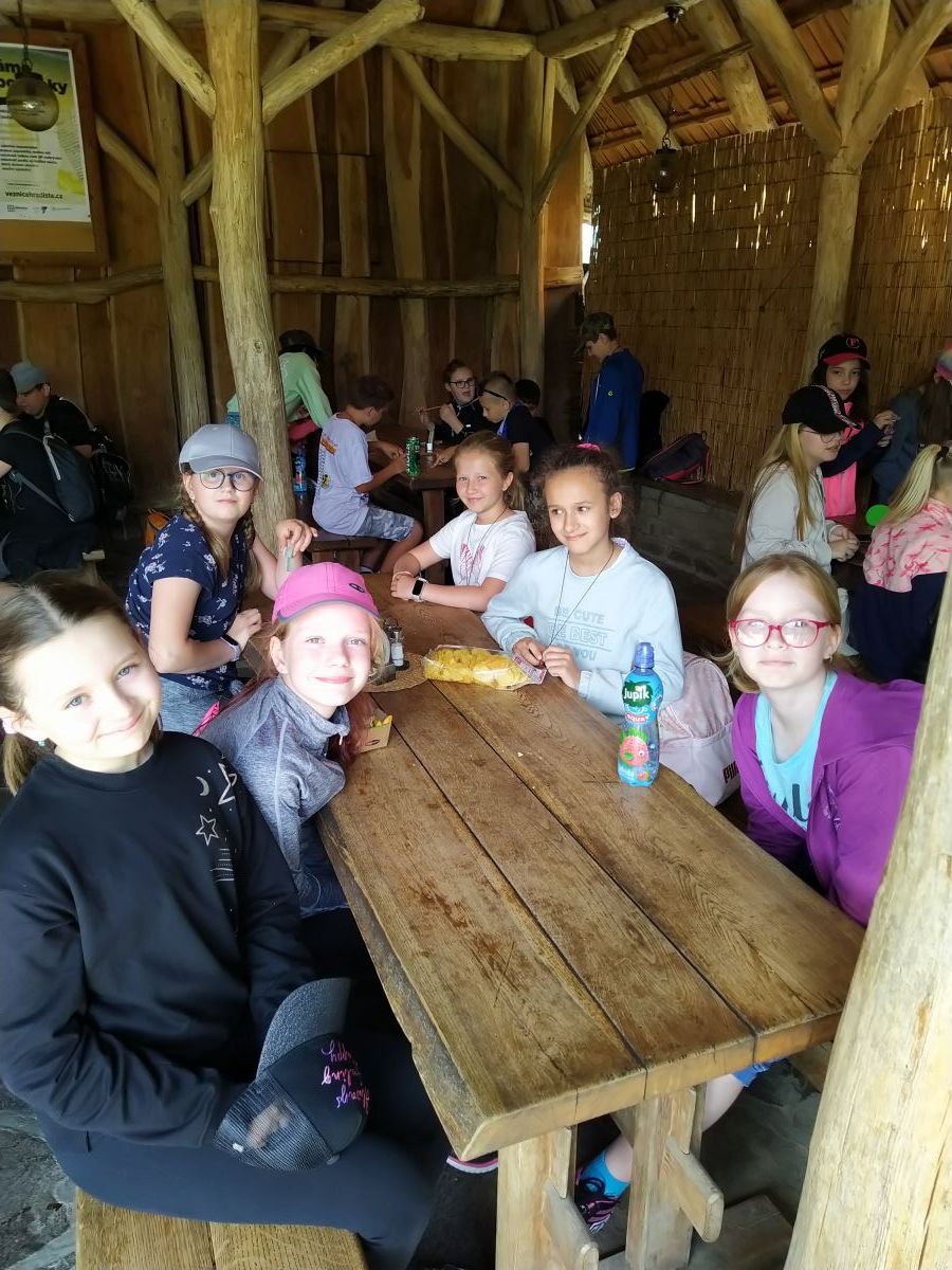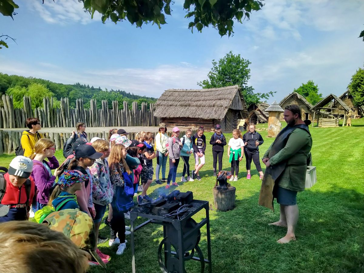 Když jsme přijeli, absolvovali jsme prohlídku Archeoskanzenu se zábavným programem. Čekal na nás kovář, prohlídka pekárny, zbrojnice, stará škola, prohlídka polozemnic a lukostřelba.