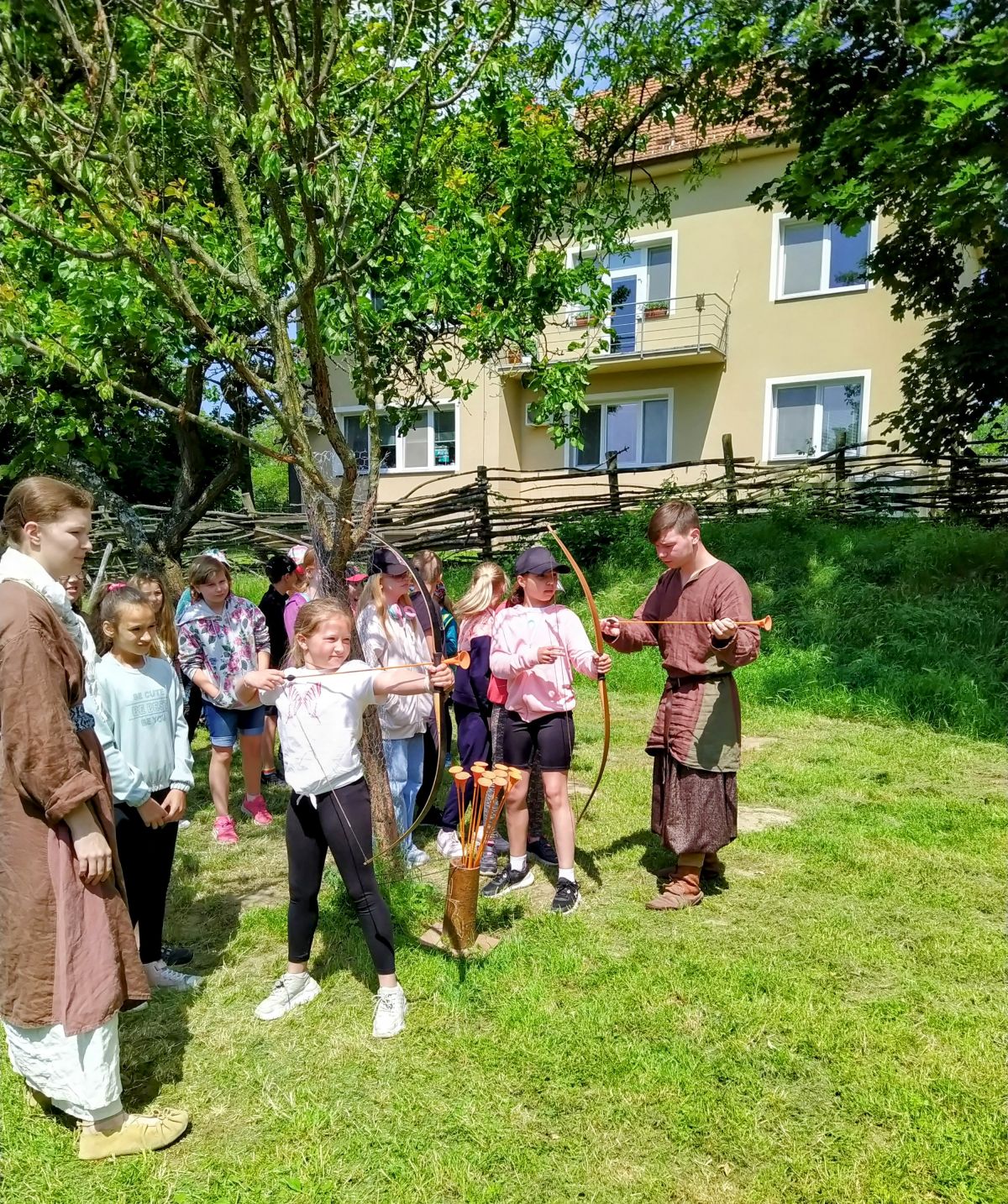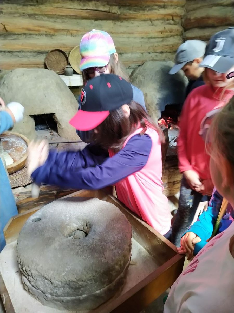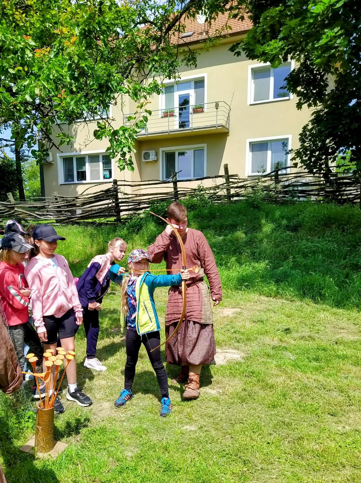 Když jsme přijeli, absolvovali jsme prohlídku Archeoskanzenu se zábavným programem. Čekal na nás kovář, prohlídka pekárny, zbrojnice, stará škola, prohlídka polozemnic a lukostřelba.