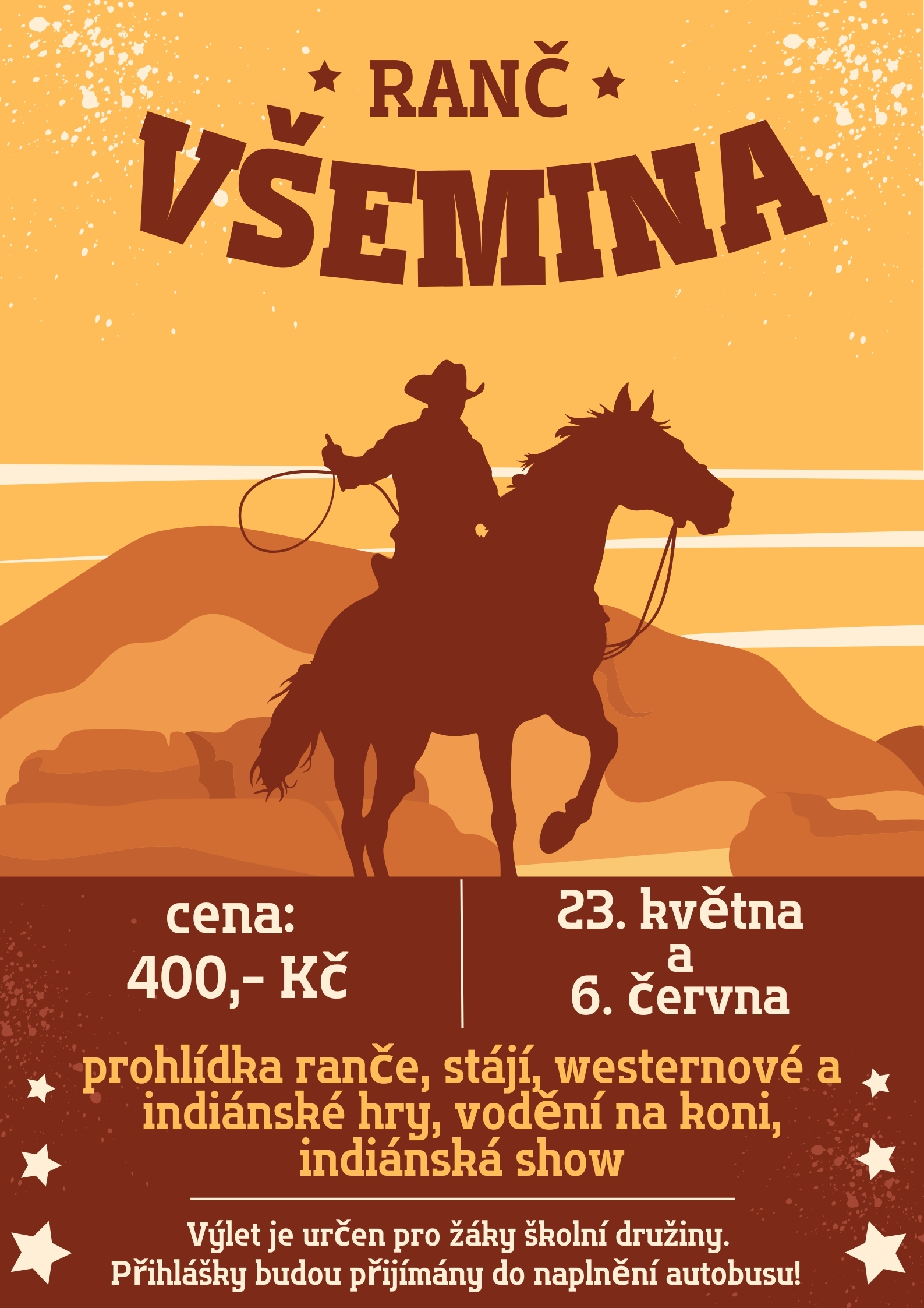 prohlídka ranče, stájí, westernové a indiánské hry, vodění na koni, indiánská show.