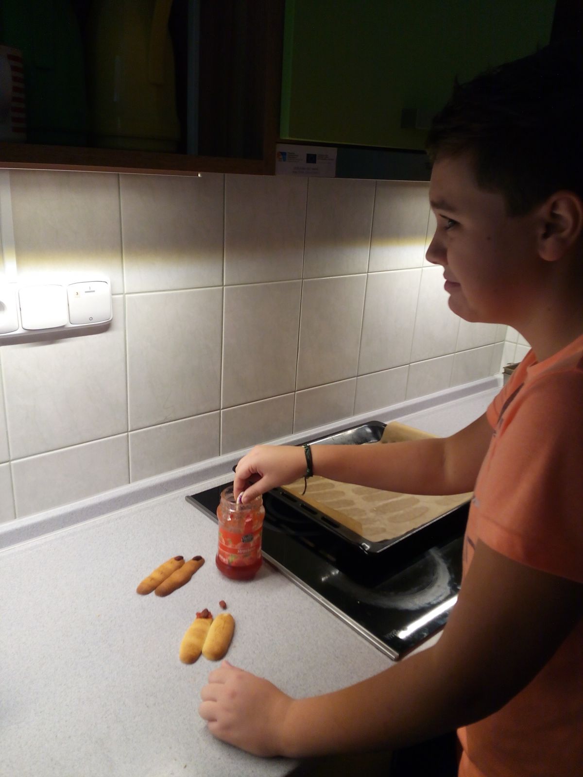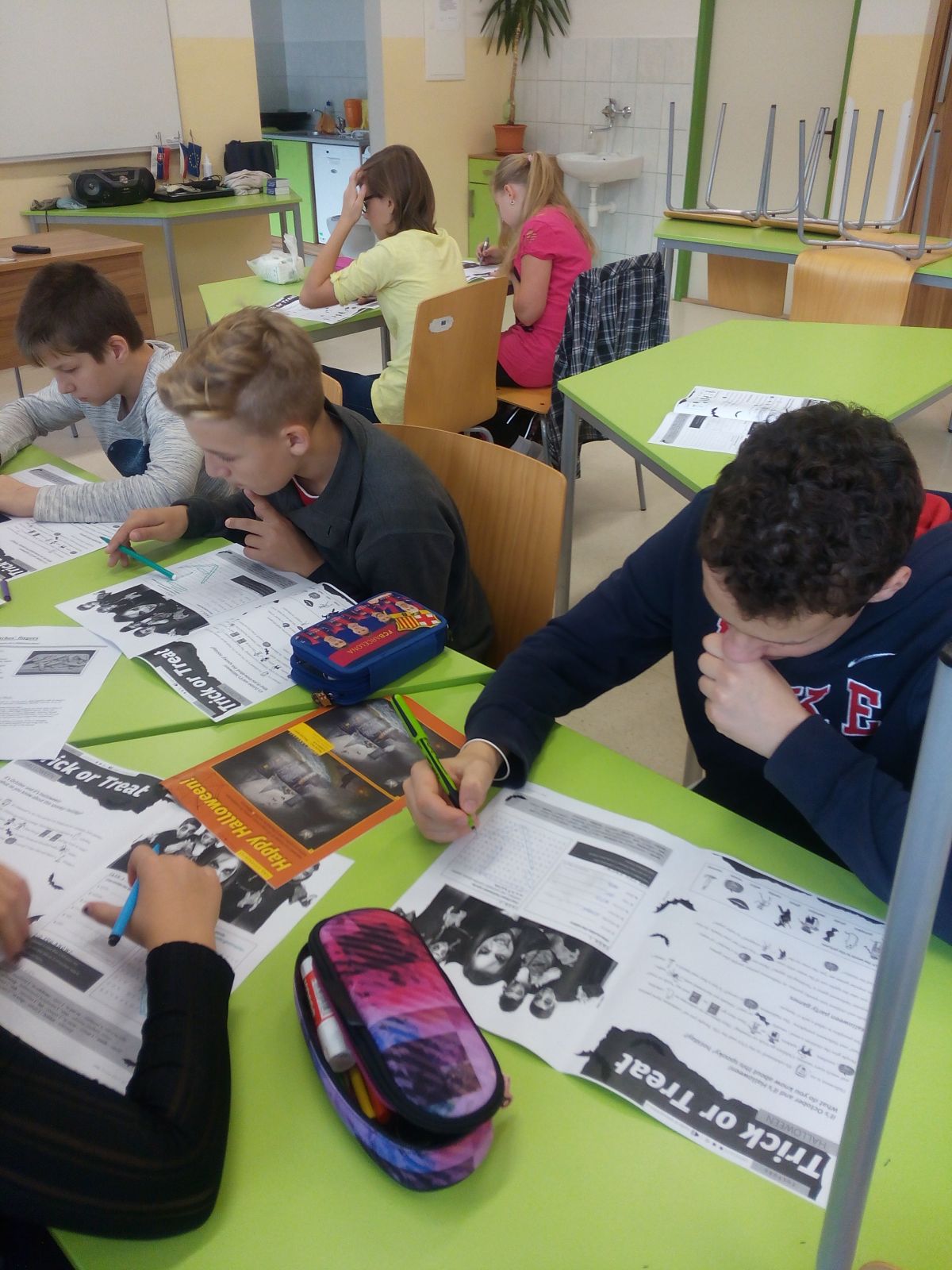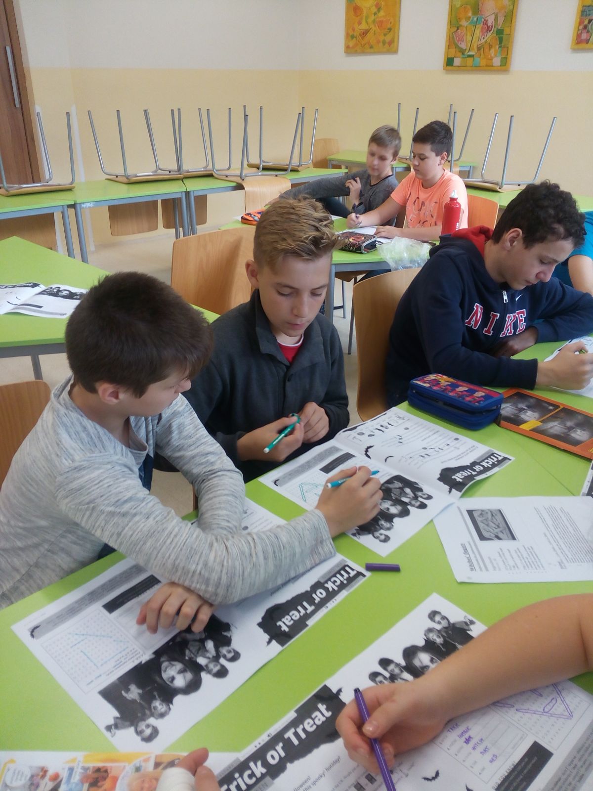 Žáci si upekli na první pohled hrůzostrašný avšak velmi chutný pokrm WITCHES‘ FINGER. Celou dobu postupovali podle tištěného receptu v anglickém jazyce. Návod, jak správně postupovat, zhlédli i na youtube. Dvouhodina velmi příjemného pečení byla doplněna o pracovní list zaměřený zejména na prohloubení slovní zásoby formou doplňovaček a osmisměrek. Na závěr si děti mohly přečíst halloweenský komiks.
