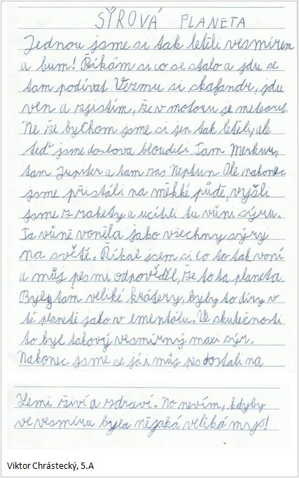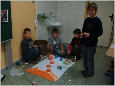 Ve výtvarné výchově vytvářeli svou planetu, v pracovních činnostech si vyrobili vesmírnou raketu. Čtení ukázek z knihy Julese Verna je také velmi zaujalo. Někteří si vypočítali zajímavé příklady souhvězdí. Největší kus práce ale udělali v přírodovědě, ze které vlastně projekt vzešel. Po skupinkách vytvořili opravdu krásné projekty. Ve slohu se pokusili napsat buď své zážitky z práce na projektu, nebo psali smyšlený příběh o vesmíru. Práce se jim velmi povedly. Jako odměna je čeká výlet do ostravského Planetária. Doufáme, že se jim výlet bude líbit. Jistě si jej zaslouží.