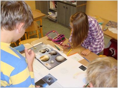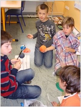 Jedna skupinka to měla tak, že na jedné straně papíru měli polystyrénové koule jako planety a na druhé straně papíru měli různé články o vesmíru.