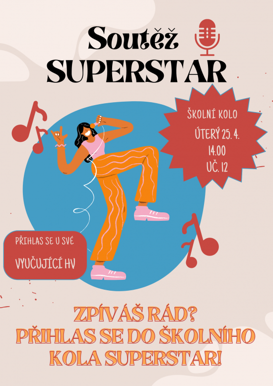 Výzva pro všechny zpěváky a zpěvačky! Přihlas se do školního kola pěvecké soutěže SUPERSTAR, které proběhne v úterý 25. 4. 2023 ve 14.00 v učebně 12. Zájemci, hlaste se u svých vyučujících HV.