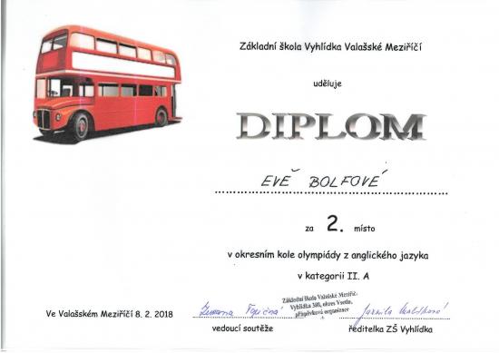 Gratulujeme Evě Bolfové  (9.r.) k úžasnému umístění v okresním kole olympiády v anglickém jazyce. Good job!